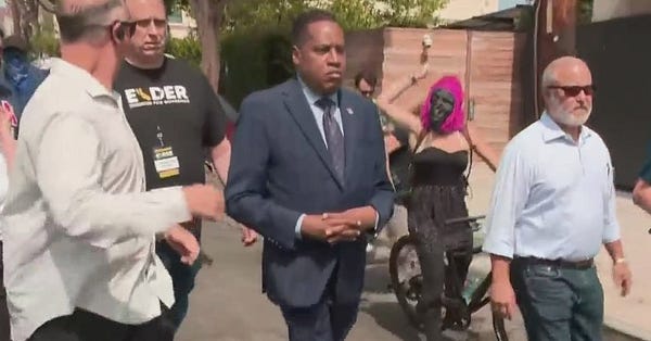 A woman in a gorilla mask threw an egg at Larry Elder during a campaign event in Venice, CA in what turns out to be a news story that should simply be one sentence long, but the more you think of it, the way more complicated it gets.